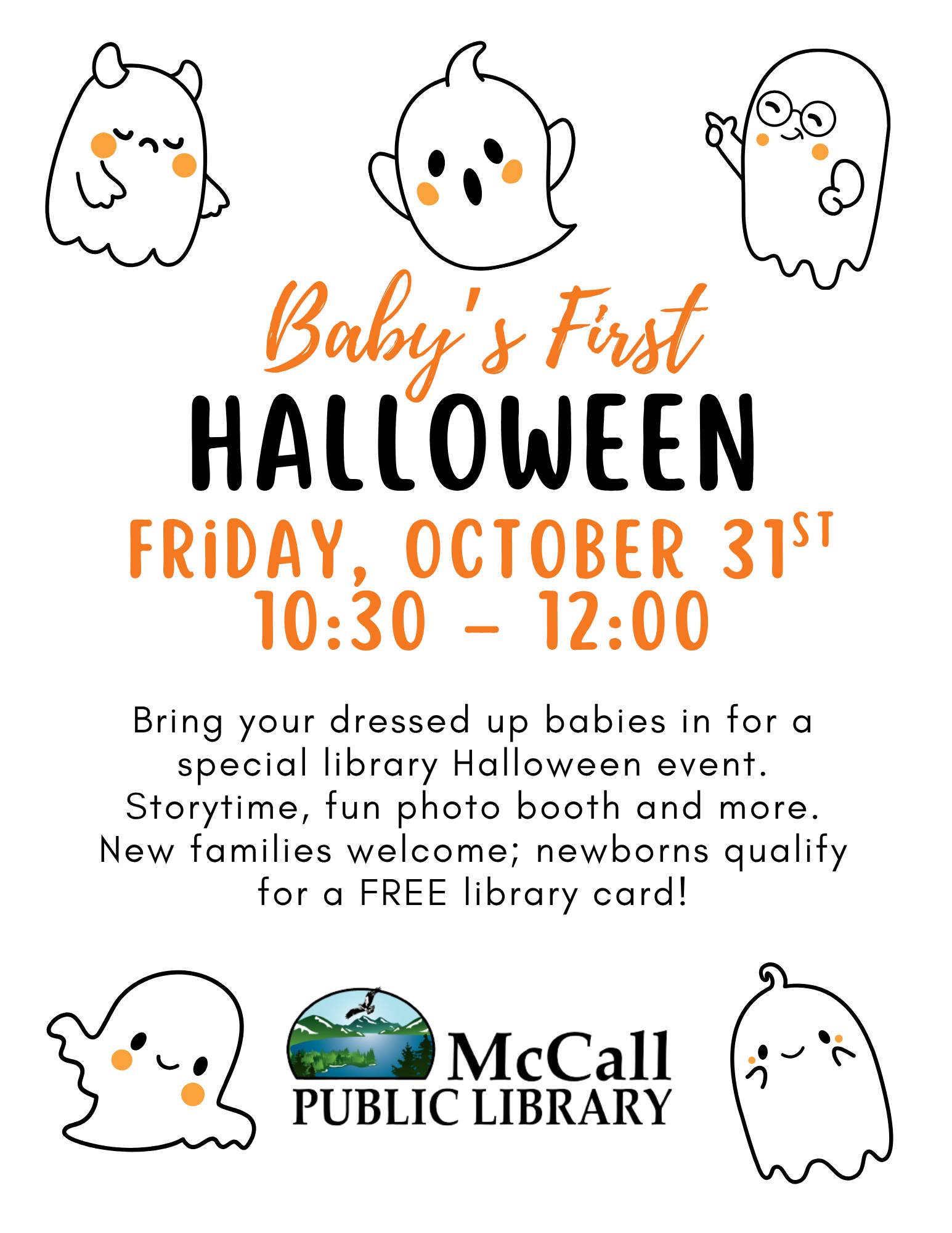 Bring your dressed up babies in for a special library Halloween event. Storytime, fun photo booth and more. New families welcome; newborns qualify for a FREE library card!