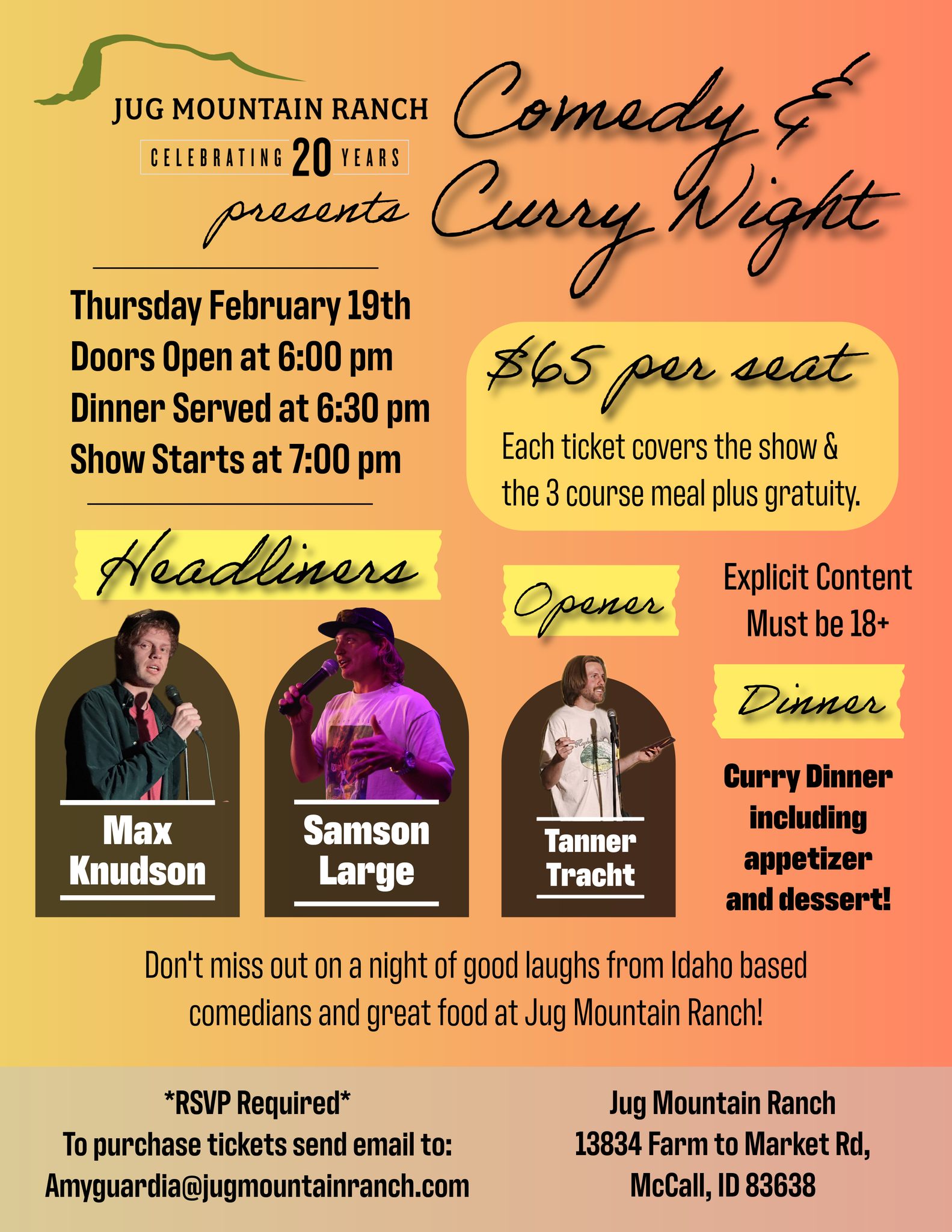 Thursday, February 19th Jug Mountain Ranch is hosting a Comedy & Curry night at the Clubhouse. For $65 you get a 3-course meal and a night full of laughter with 3 Idaho based comedians.