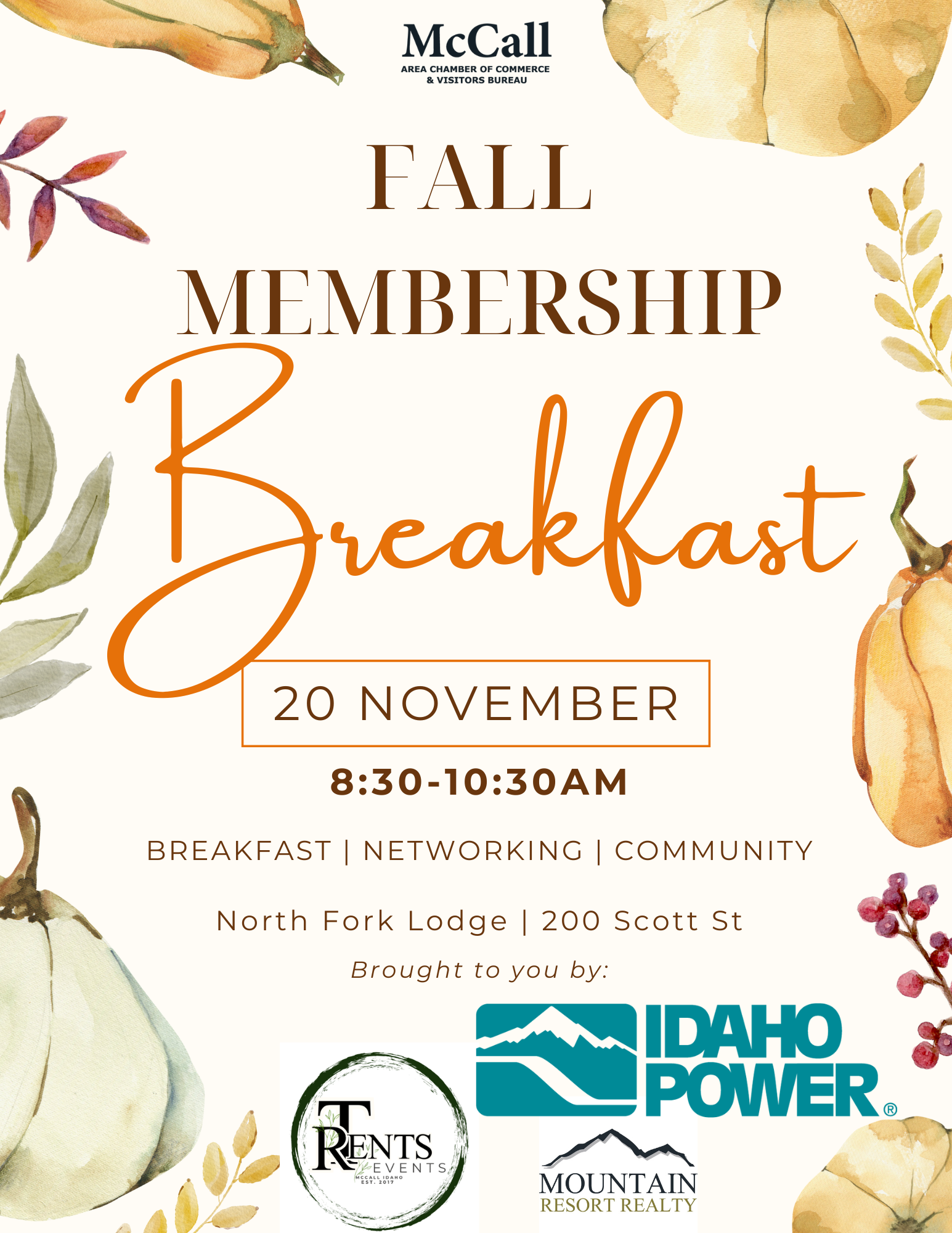 Join us for our annual Fall Membership Breakfast on Thursday, November 20th from 8:30-10:30am at North Fork Lodge! Come for a delicious breakfast, stay to hear insights and stories from local businesses and nonprofits who excel in fostering collaboration and community. This year’s theme is “Neighbors in Business.”