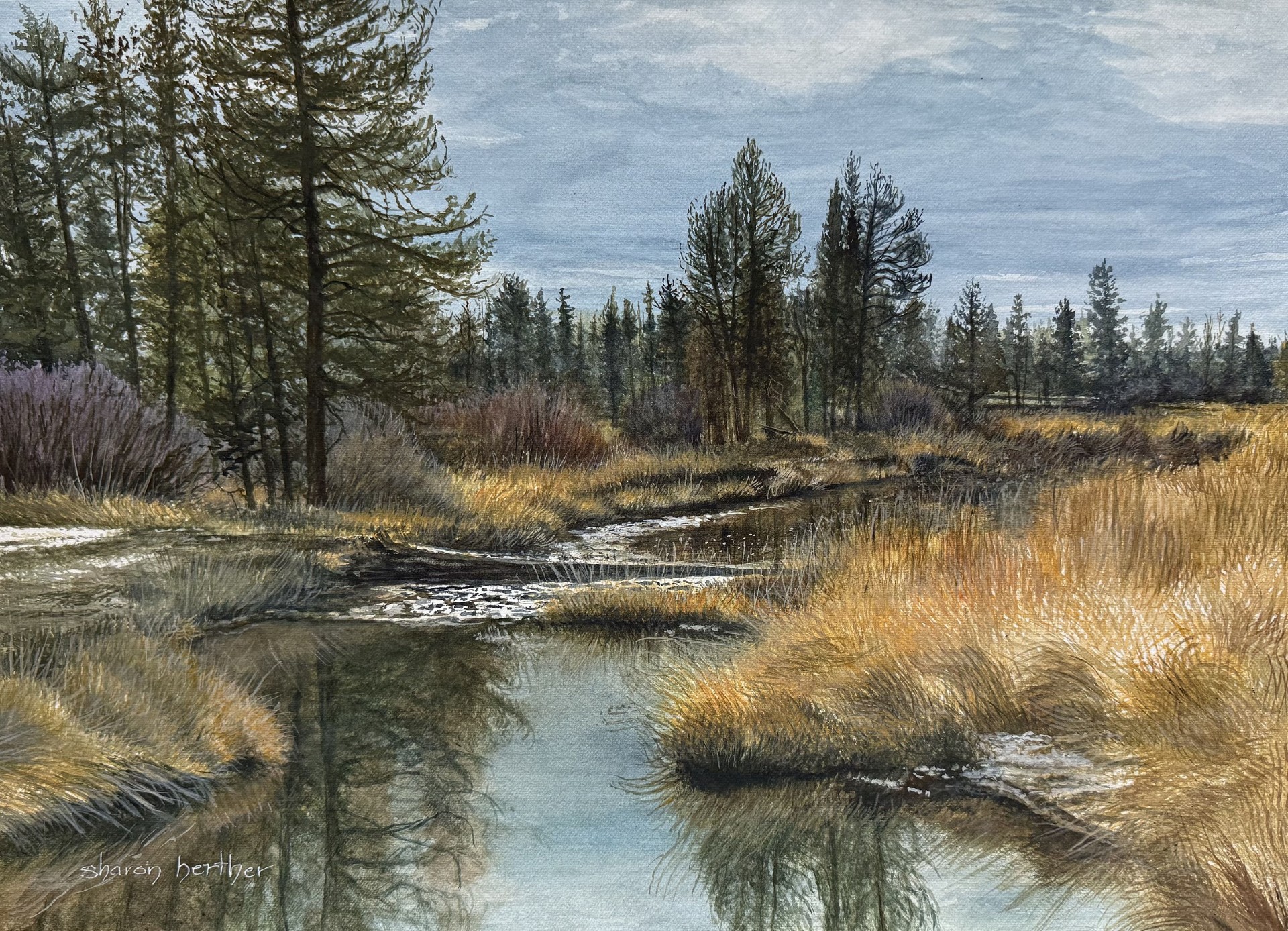 Featured for the month of March are the Idaho-inspired landscape paintings by gallery member and local artist Sharon Herther. Raised on a dairy farm in Meridian, Idaho, Sharon worked outdoors and developed a deep love of the Idaho outdoors. Her past experience includes creating interpretive signs for the State of Idaho, illustrated Discovery Maps for McCall and Twin Falls and landscapes painted on heart sculptures for the Payette Land Trust. Her paintings are known for their exquisite beauty and detail.