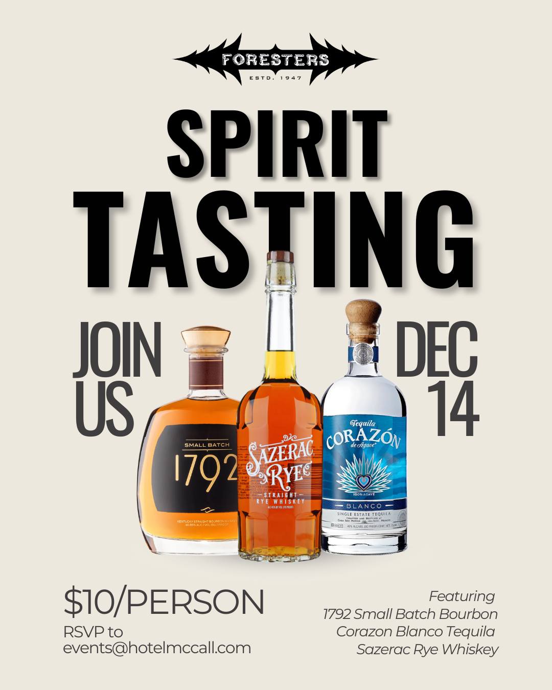 December 14th – Foresters will be having a spirit tasting featuring 1792 Small Batch Bourbon, Corazon Blanco Tequila, and Sazerac Rye Whiskey.
