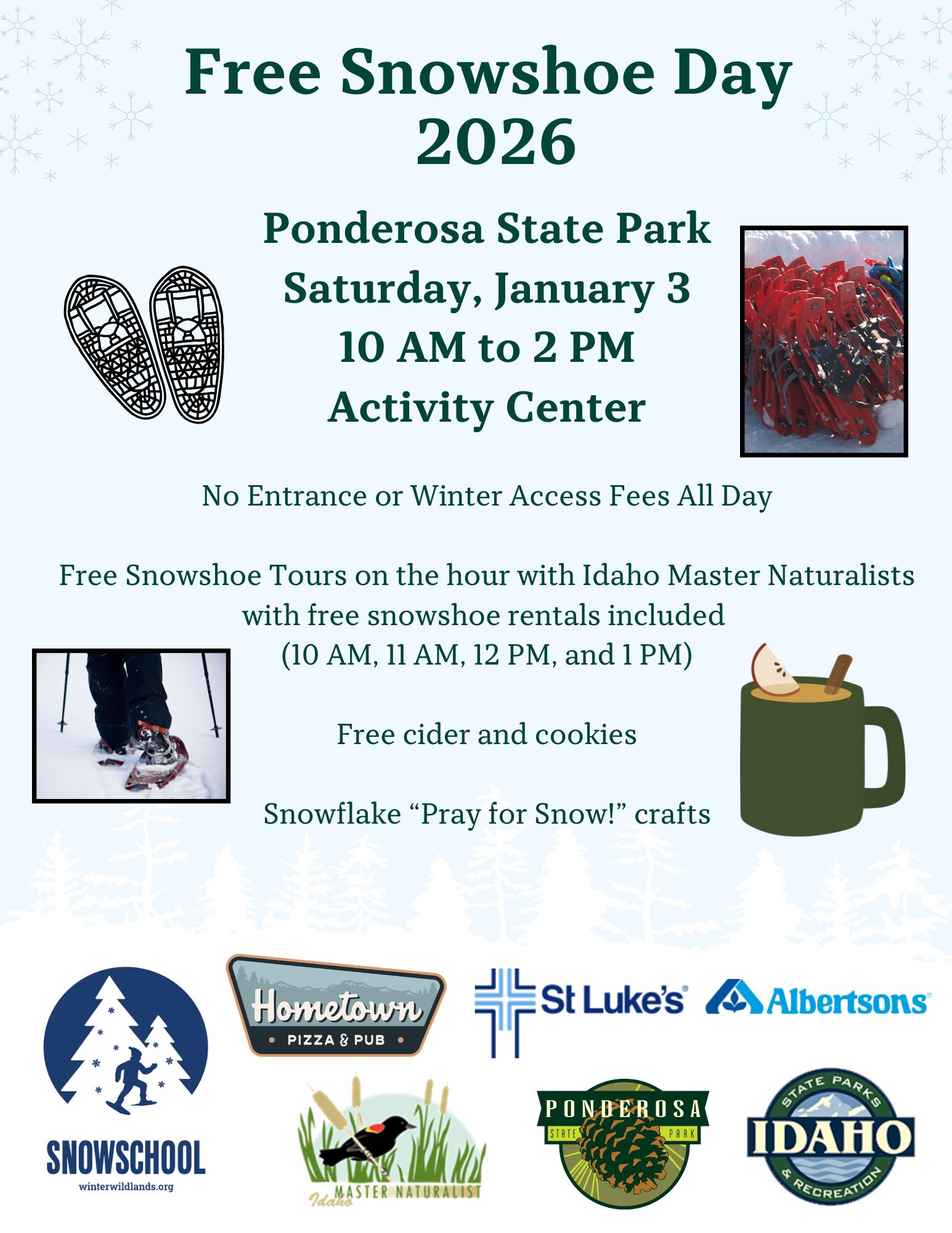 On Saturday, January 3rd Ponderosa State Park will be waiving all entrance and winter access fees. There will be free snowshoe tours offered by Idaho Master Naturalists at 10 am, 11 am, 12 pm, and 1 pm.