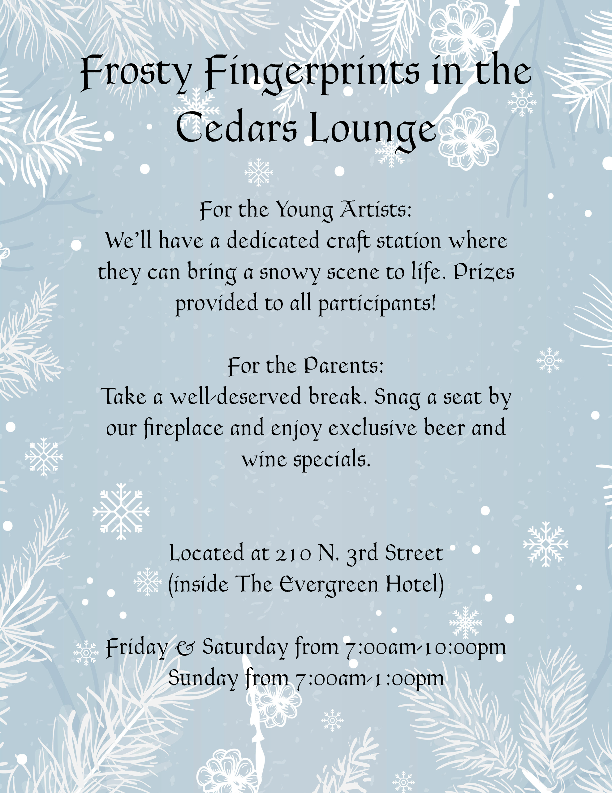 Calling all young artists! Come to the Cedars Lounge (inside The Evergreen Hotel) and bring a snowy scene to life. Fun wintery prizes for all participants!