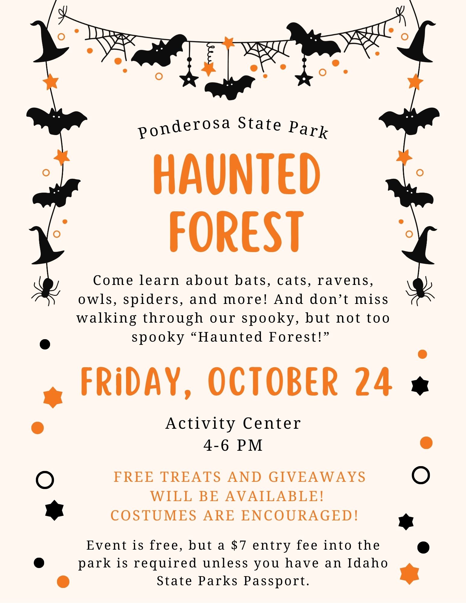 On Friday, October 24 from 4-6 PM at the Activity Center, Ponderosa State Park will be hosting its “Haunted Forest” Event. Come learn about bats, ravens, owls, spiders, and cats (think mountain lions and bobcats)! Also enjoy a self-guided spooky, but not too spooky “Haunted Forest” walk. Treats and giveaways will be available and costumes are encouraged.