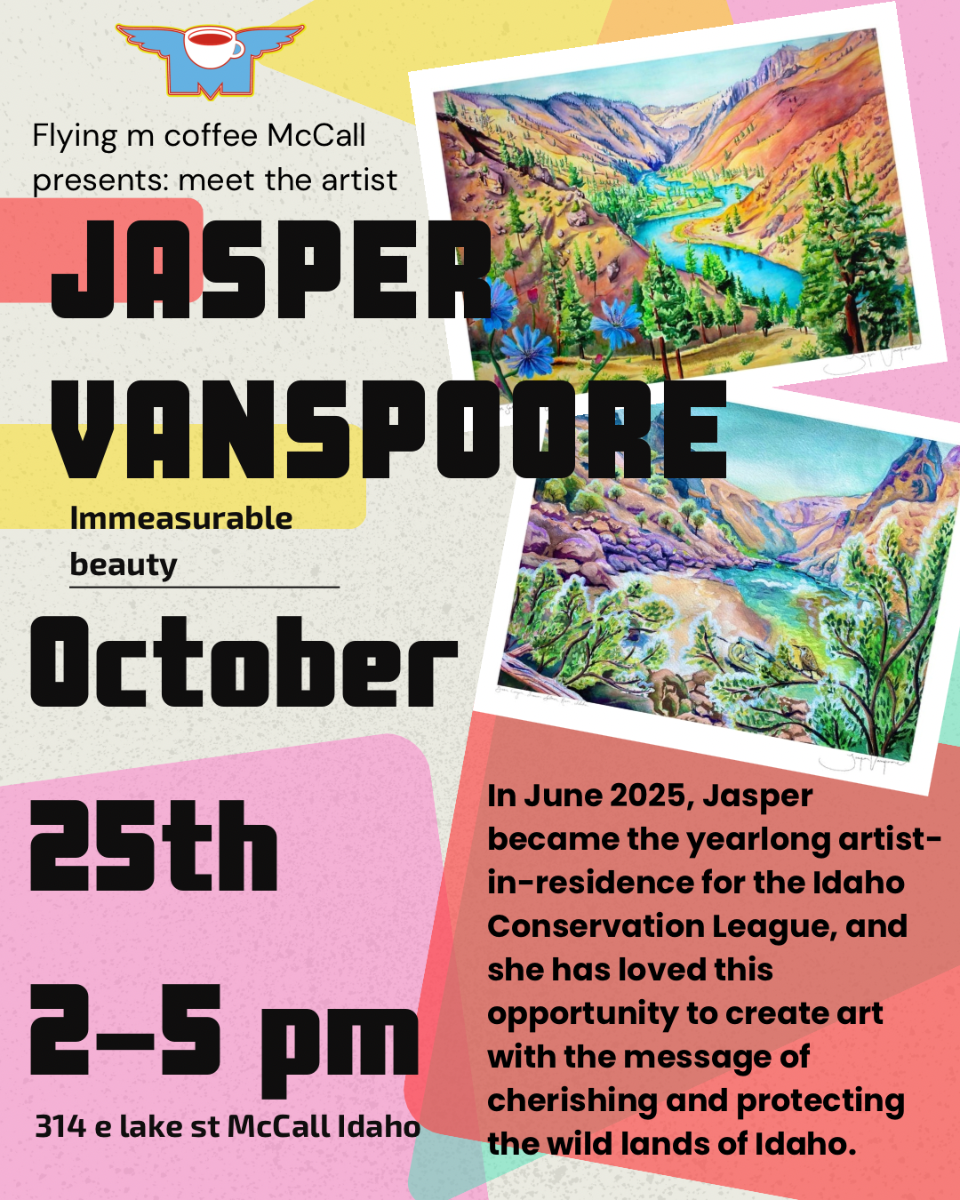 Meet Jasper Vanspoore, Idaho conservation artist in residence. Flying M Coffee will be hosting and displaying Jasper’s pieces. Join us for the opening reception Saturday, October 25th from 2pm-4pm.