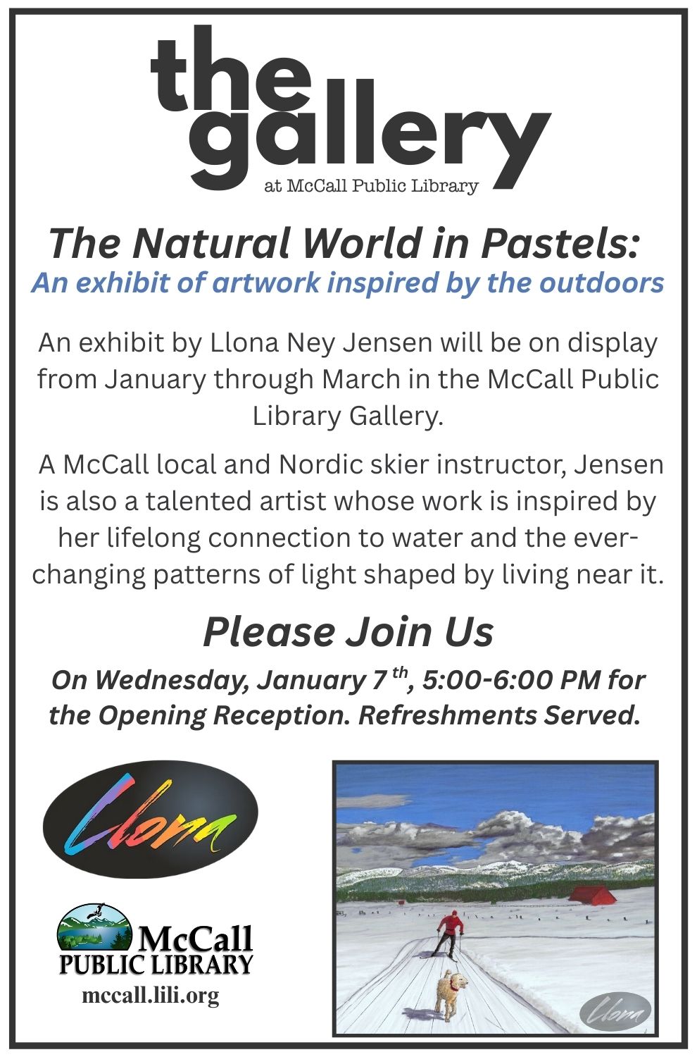 Join us for the opening reception of The Natural World in Pastels: An exhibit of artwork inspired by the outdoors by McCall local Llona Ney Jensen which will be on display from January through March in the McCall Public Library Gallery. A McCall local and Nordic skier instructor, Jensen is also a talented artist whose work is inspired by her lifelong connection to water and the everchanging patterns of light shaped by living near it. Refreshments served.