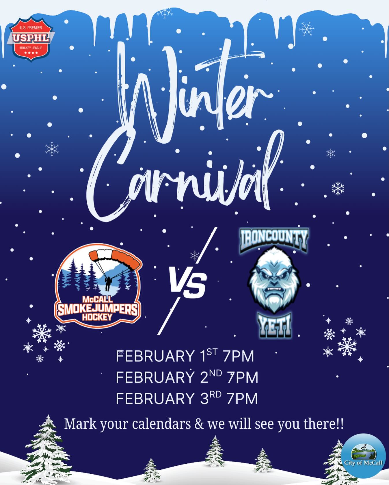 Mark your calendars for some Winter Carnival Smokejumpers hockey! Three nights of hockey against the Ironcounty Yeti.