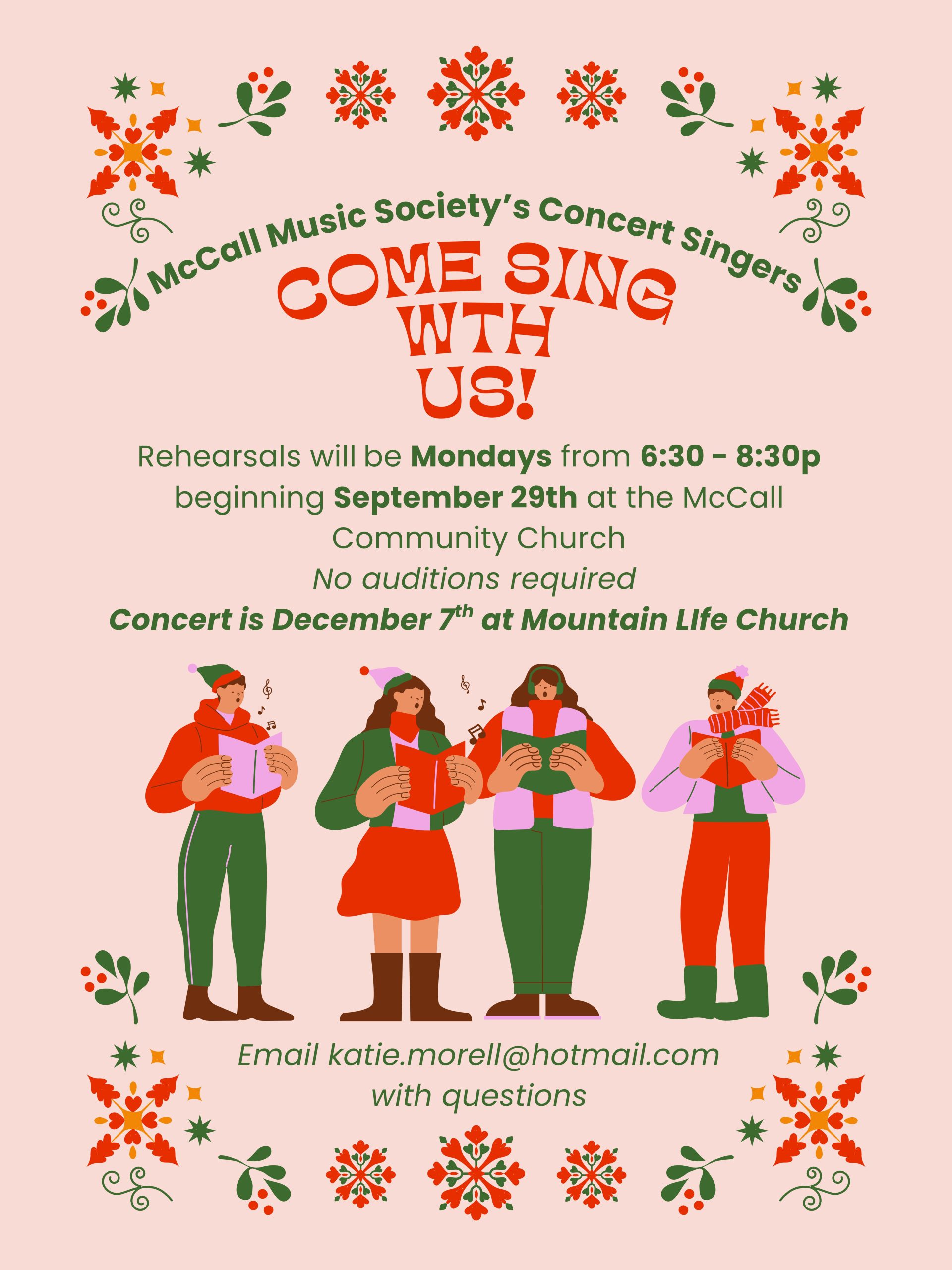 Rehearsals will be Mondays from 6:30-8:30pm at the McCall Community Church beginning September 29th.