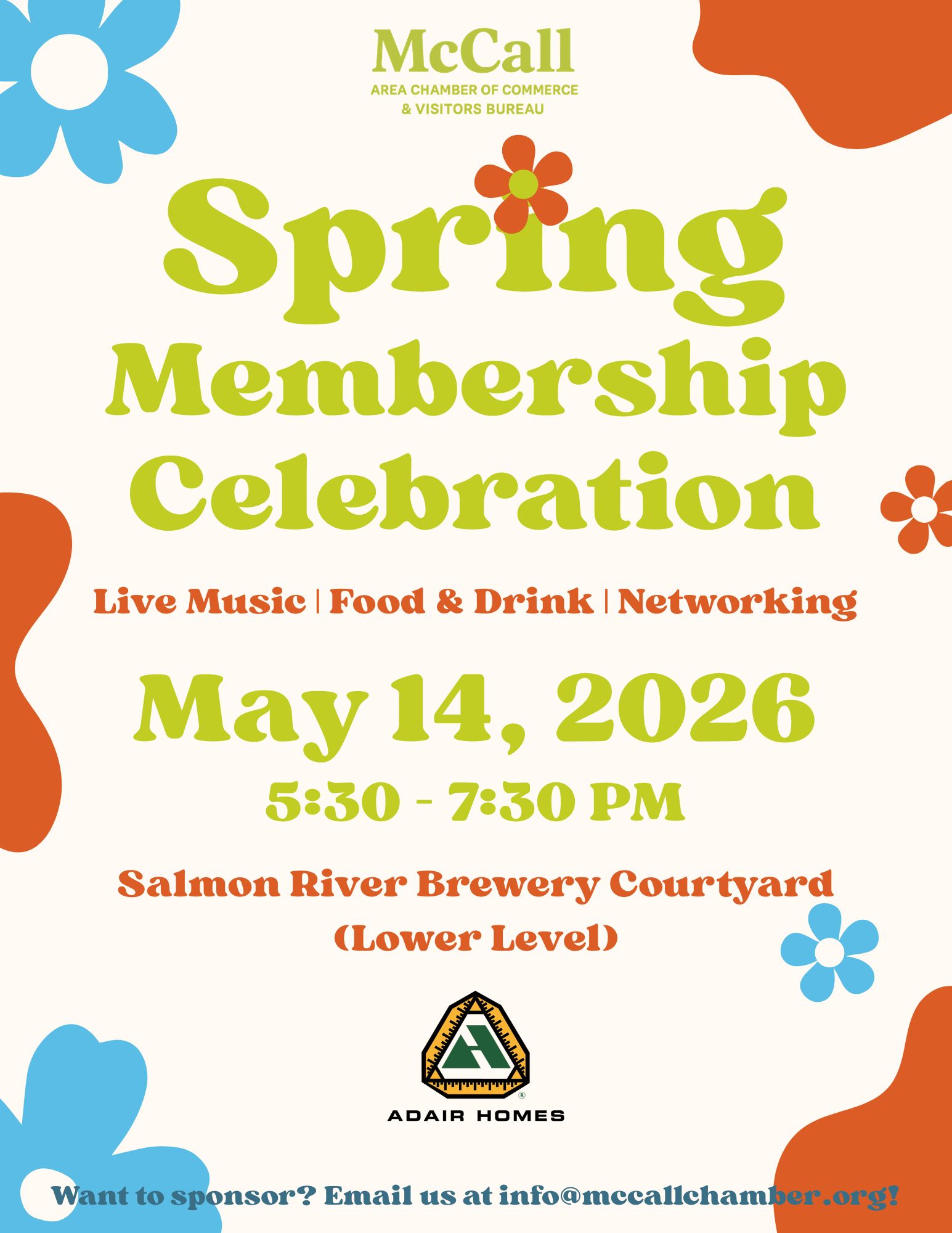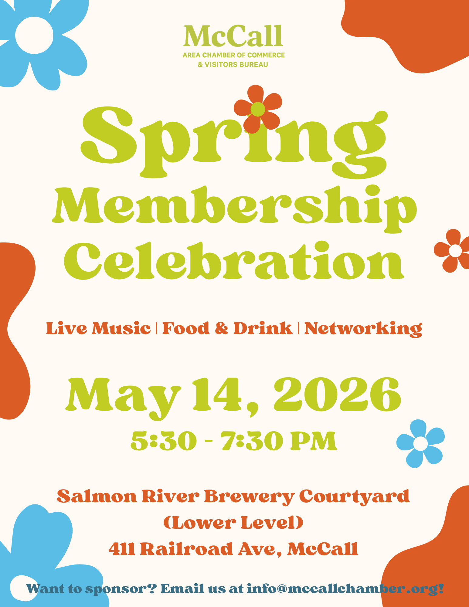 Save the date! The McCall Area Chamber’s Spring Membership Celebration will be held on Thursday, May 14th from 5:30-7:30pm in the Salmon River Brewery Courtyard.