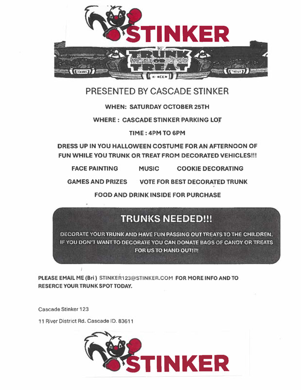 Dress up in your Halloween costume for an afternoon of fun while you Trunk or Treat from decorated vehicles at the Cascade Stinker parking lot! This event is on Saturday, October 25th from 4pm – 6pm. There will be face paining, music, cookie decorating, games & prizes, food and drink for purchase, and a Best Decorated Trunk voting contest! We’ll see you there!