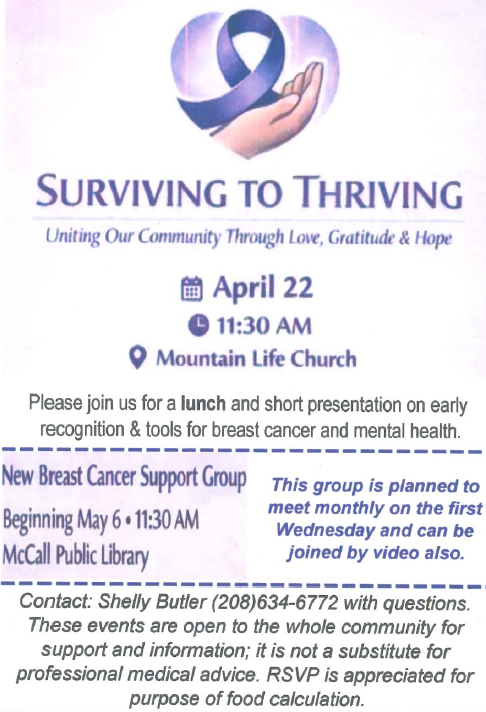 Join us at 11:30am on April 22nd at Mountain Life Church for a lunch and short presentation on early recognition and tools for breast cancer and mental health.