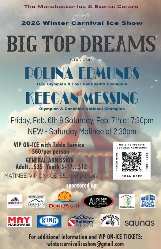 The Manchester Ice & Event Centre is thrilled to present the 2026 McCall Winter Carnival Ice Show – a magical, circus-inspired production featuring world-class skating, aerial artistry, and unforgettable entertainment for the whole family!