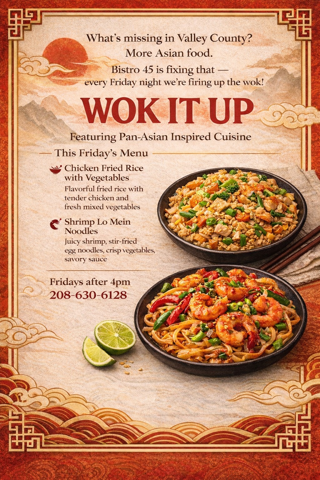 Get ready to “Wok It Up” on Friday, February 20th at Bistro 45. Availble after 4pm for dine-in or take-out!