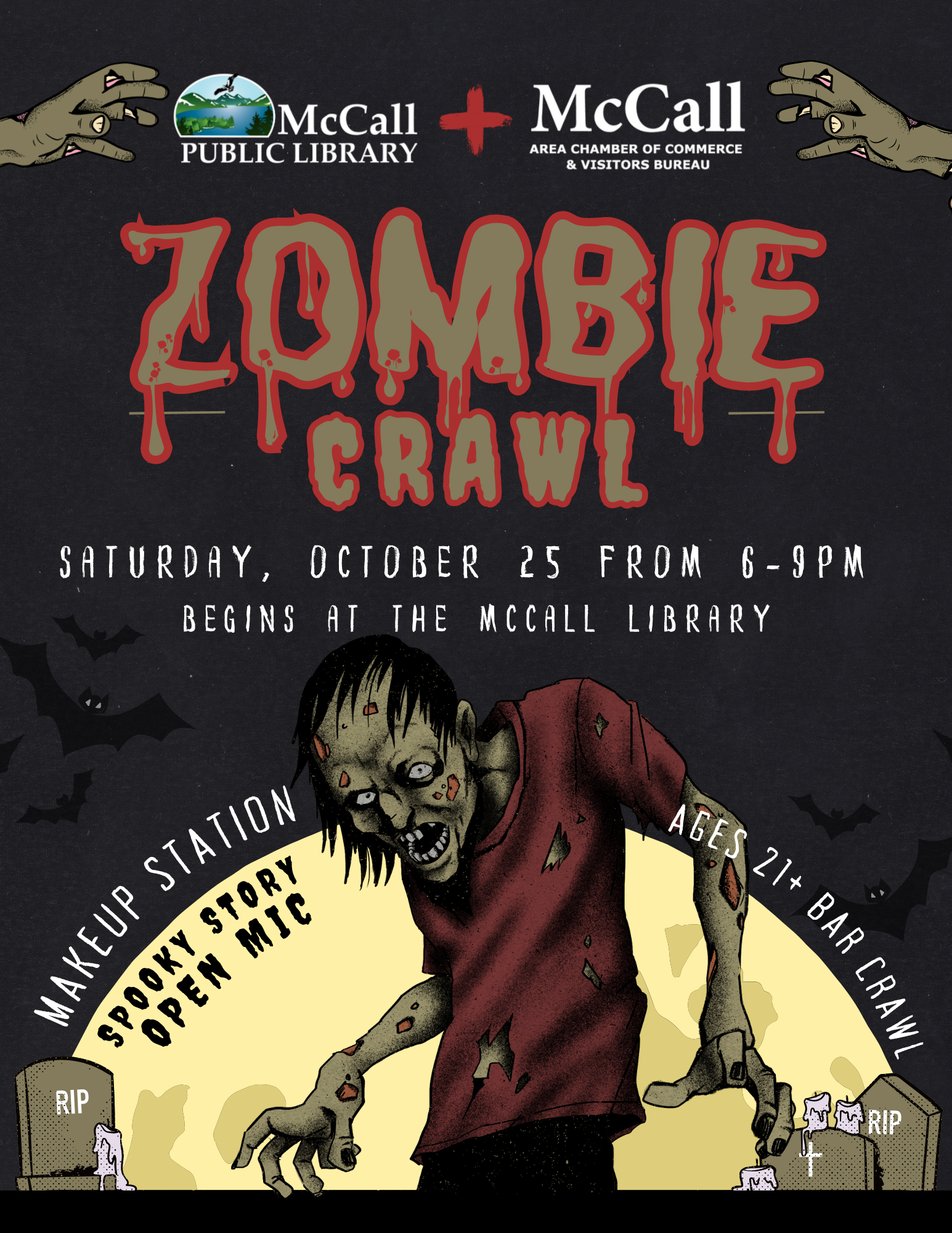 The Zombie Crawl is a zombie-themed bar crawl highlighting the McCall Ale Trail and bringing locals out for some Halloween fun! Join us for our zombie makeup station and a spooky open mic at the library, then shuffle your way between stops for drinks with the undead. Ages 21+.