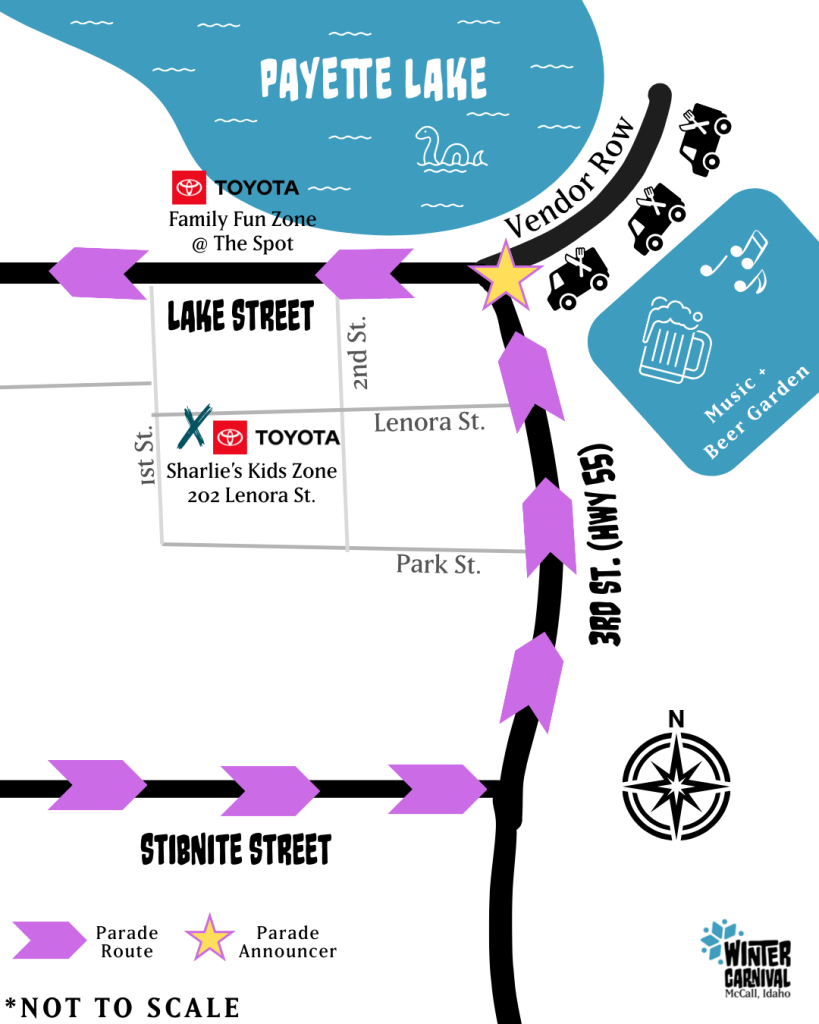 The highlight of the McCall Winter Carnival is almost here! The Parade is a Mardi Gras-style celebration that calls all carnival-goers to enjoy a long procession of local performers and community floats as they make their way through town. Take a look at the parade route below and start planning your perfect viewing spot! The Mardi Gras Parade will be on Saturday, February 7, 2026 at 12:00 pm
